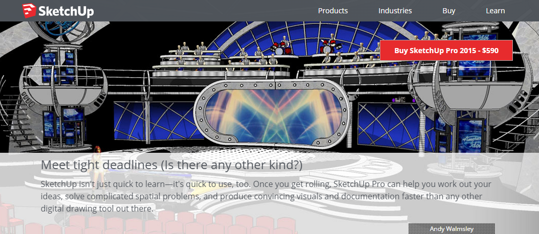 Laten we even een mogelijke 3D tool bekijken. We nemen SketchUp om praktische redenen: Er is een gratis versie beschikbaar. Best wel in je eventbureau de 400 € voor de professionele versie ophoesten.